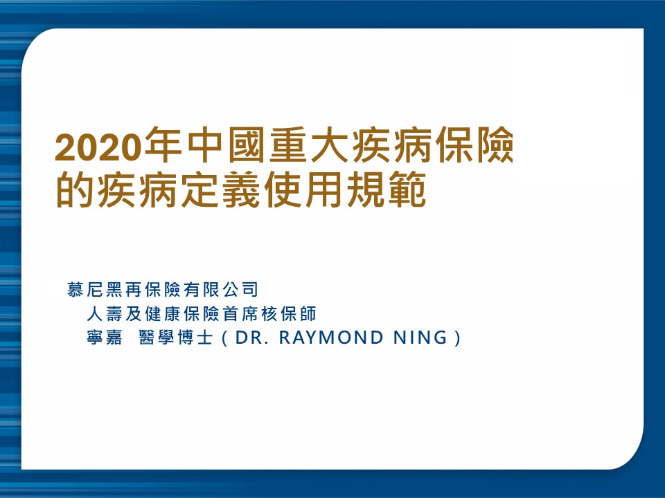 In November 2020, the China Insurance Association and the Chinese Medical Association jointly revised the disease definitions of critical illness insurance established in 2007 published the "Usage Guidelines for Disease Definitions of Critical Illness Insurance in China 2020". The purpose of this course is to assist insurance intermediaries in Hong Kong in betther understanding the disease definitions for critical illness insurance (refer to as "specified illness insurance" in Hong Kong) as defined in mainland China by explaining and elaborating on these "Usage Guidelines". We will explore the similarities or resemblances between the definitions in both regions' industries, as well as areas that require special attention. The aim is to equip insurance intermediaries with more professional knowledge to provide higher-quality services to policyholders.